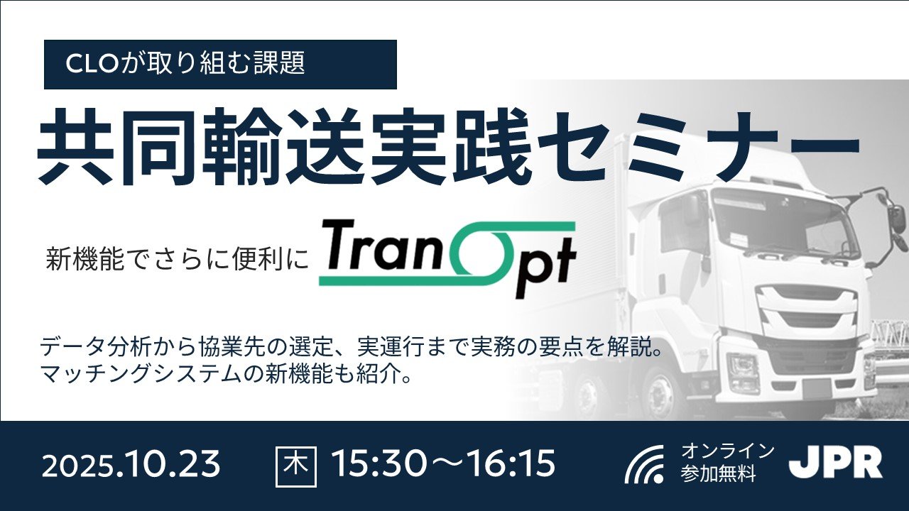 2025年10月23日(木)に、共同輸送マッチングシステムを核とし実運行までに併走するサービス「TranOpt(トランオプト)」の無償オンラインセミナーを開催します。