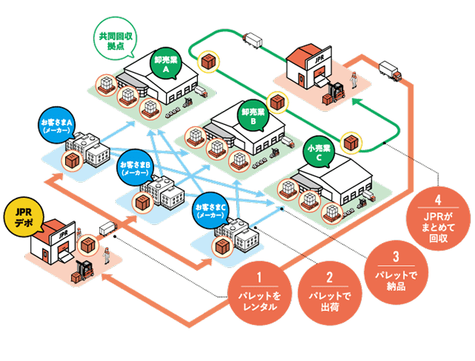 パレットでユニット化された荷物が、企業間をリレーされていく。その裏側ではパレットを社会に循環させる「しくみ」が機能しています。JPRは、パレットの供給ネットワークと、使用後のパレットをまとめて回収して再供給する「共同回収システム」を運営しています。