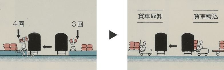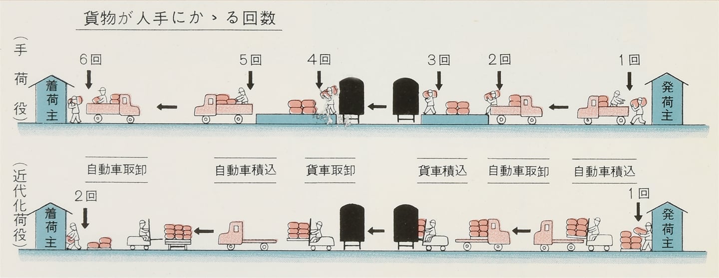 上下段で構成され、上段に「手荷役」(機械を使わず人手で荷物の積み下ろしをすること)が、下段に「近代荷役」が描かれていて、人手に代わってパレットとフォークリフトが使われていることが分かります。また、図中には手荷役を行う回数が示されています。