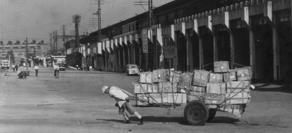 この写真は1952年頃、平原先生が撮影したものです。すでに昭和初期に、このような厳しい物流の現場に触れていた平原先生は、物流現場の人々を"肉体消耗的な苦役"から救わなければならない、という想いを強めていきます。海外の文献を通じてパレットの存在を知っていた平原先生は1949年、神戸港で実際のパレットを使っている場面に出会います。この時の喜びを次のように書き残しています。