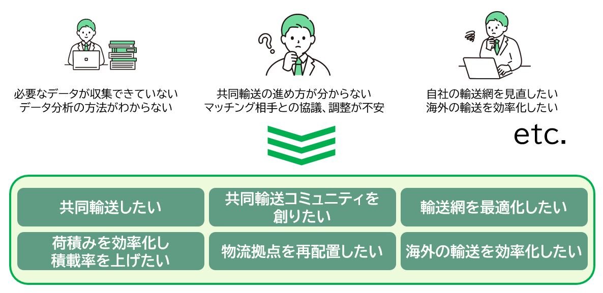同業種間(業界内)、自社輸送網やグループ会社間等のプライベートな共同輸送マッチングも実現します。